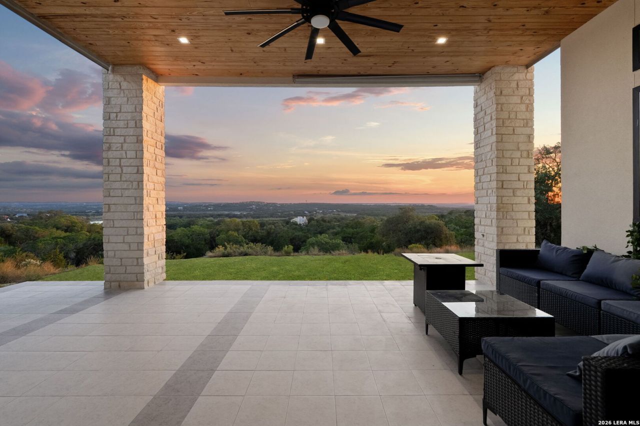 Perched atop a private 3.62-acre hilltop in the Texas Hill Country near Canyon Lake, this exceptional custom estate captures breathtaking panoramic Hill Country and Guadalupe River views along with unforgettable sunsets. Located in the prestigious gated community of The Peninsula at Mystic Shores, the home offers a rare combination of privacy, elevation, and luxury living within convenient reach of Austin, San Antonio, New Braunfels, and Wimberley. A grand 9-foot double iron door welcomes you into an impressive open-concept living space featuring soaring 22-foot ceilings, expansive windows, and a massive sliding glass wall that perfectly frames the surrounding Texas Hill Country landscape. The living room is anchored by a dramatic 22-foot floor-to-ceiling fireplace, creating a striking centerpiece for both everyday living and entertaining. Custom ceiling designs throughout the home add distinctive architectural elegance. The gourmet kitchen is designed for gathering and entertaining with a massive center island, custom cabinetry, and high-end Thermador stainless steel appliances. The open layout seamlessly connects the kitchen, dining, and living areas while maximizing the spectacular views. Privately located on the first floor and thoughtfully separated from all other bedrooms, the luxurious primary suite offers a peaceful retreat with oversized picture windows showcasing panoramic Hill Country and Guadalupe River views. The spa-inspired bathroom features a spacious walk-in shower with dual rain showerheads and 12 body jets, along with a stand-alone soaking tub designed for relaxation. Four additional bedrooms each include walk-in closets and private en-suite bathrooms, providing comfort and privacy for family or guests. A dedicated office with sliding glass doors opens to the patio, while the upstairs loft and media room provide additional space for relaxation and entertainment. Outdoor living is exceptional with a covered patio, covered front balcony, and covered upper balcony positioned to capture sweeping Hill Country scenery and unforgettable sunsets. A fully equipped outdoor kitchen creates the perfect setting for entertaining while enjoying the peaceful surroundings. Additional features include smart home technology, a spacious three-car garage, water softener system, tankless water heater with unlimited hot water, and WiFi-controlled irrigation system. Residents of Mystic Shores enjoy premier amenities including a lakeside pool, sports courts, playground, pavilion, and private access to Canyon Lake. Conveniently located in the Texas Hill Country near Austin, San Antonio, New Braunfels, and Wimberley, this extraordinary hilltop estate offers a unique lifestyle surrounded by nature, privacy, and panoramic views.